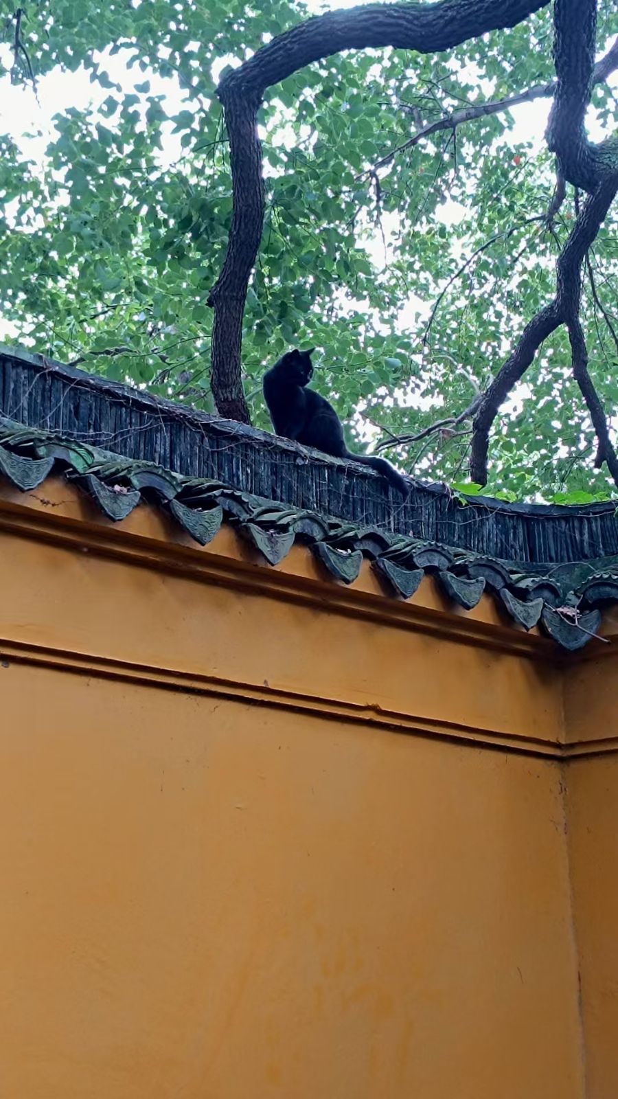 午后先绕去西园寺,红墙竹影间藏着几分禅意。刚走到大雄宝殿旁的紫藤架下,就见三只橘猫蜷在石阶上晒太阳,毛茸茸的尾巴偶尔轻轻扫过青砖。抬头时又撞见惊喜 —— 墙头趴着只小黑猫,墨色的毛被阳光晒得泛着柔亮的光泽,它前爪搭在墙沿,尾巴垂在墙外轻轻晃悠,偶尔抬眼望一眼檐下的风铃,眼神慵懒又惬意,像团晒暖的黑绒球。有只橘猫胆大,凑过来蹭我的鞋尖,圆眼睛里映着风铃,模样温顺。寺里的僧人说,这些猫咪是西园的 “常客”,常年伴着香火与钟声,连性子都透着几分淡然。
