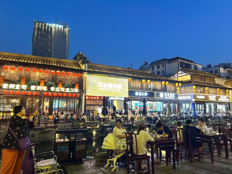 天色渐渐暗了下来,灯光亮起来,青石板路泛着光,暖光映在河面,像撒了满河碎钻,伴着点着灯笼的河边铺子,烟火气混着古意。石板路上人来人往,完全就是一幅夜晚版清明上河图。