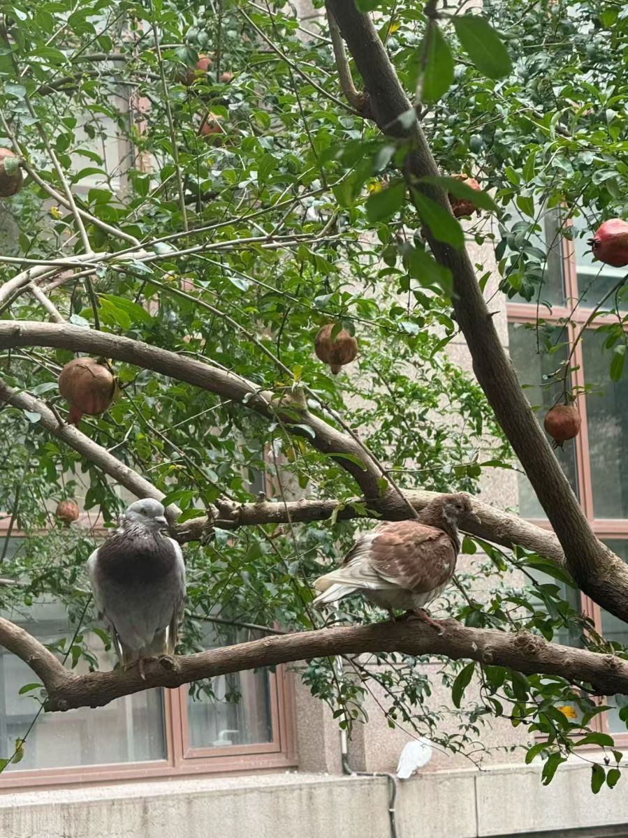 这张画面,是秋日里一抹悠然的日常:石榴树的枝桠间,正栖着两只鸽子,裹着季节的温软气息。树的枝叶还带着夏末的翠色,却已坠满了红褐相间的石榴——有的外皮皱起,像裹了层秋日的薄纱,有的还泛着鲜活的艳红,坠在细枝上微微晃。深褐的枝干纹理粗糙,承着两只鸽子的轻身:左边那只羽色是灰与紫褐的交织,颈间绒毛泛着柔和的光泽,正偏头望着斜下方,神态慵懒得像刚晒过太阳;右边的鸽子则裹着棕褐与米白的羽衣,尾羽轻垂,爪子稳稳扣着枝桠,背影里都是松弛。背景是浅褐色的楼墙,窗棂镶着暖调的红边,玻璃映着枝叶的碎影,让这方小天地既沾着烟火气,又藏着独处的静。风该是轻的,没摇落枝叶,只让石榴的轮廓更柔和;光线也是柔的,裹在鸽羽与叶尖上,把秋的燥意都滤成了温煦。这不过是寻常的一刻:树在结它的果,鸟在栖它的枝,时光就浸在这淡而真切的闲适里,像被风轻揉过的日子,妥帖又温柔。