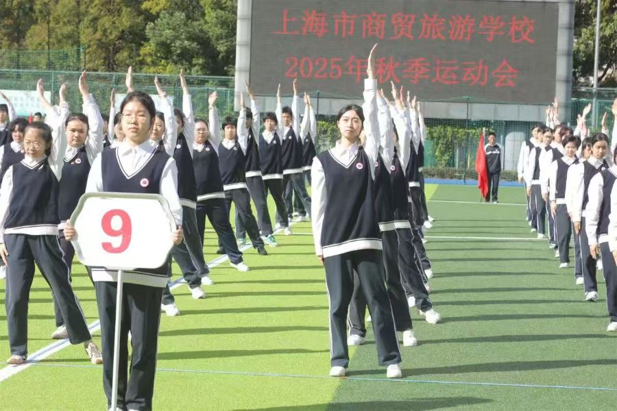 上海市商贸旅游学校2025秋季运动会的绿茵场,被24营销班的白衫藏青背心点亮。举着9号引导牌的同学稳稳站定,身后的我们抬臂成线——广播体操的每一个伸展都踩准节奏,校服衣角随动作轻扬,连掌心向上的角度都像被标尺量过般一致。