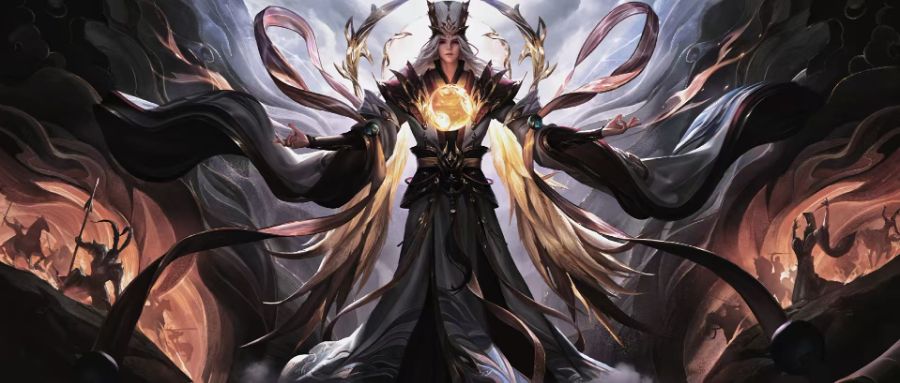 图中居于光影中心的玄衣谋士,正是被曹操称为“吾之子房”的荀彧。他周身环绕的阴阳法球与飘带,既象征着“王佐之才”的经天纬地之能,又暗喻着他一生在“匡扶汉室”与“辅佐曹魏”间的撕裂——掌心托举的光明,终究没能照亮汉末的乱世长夜。