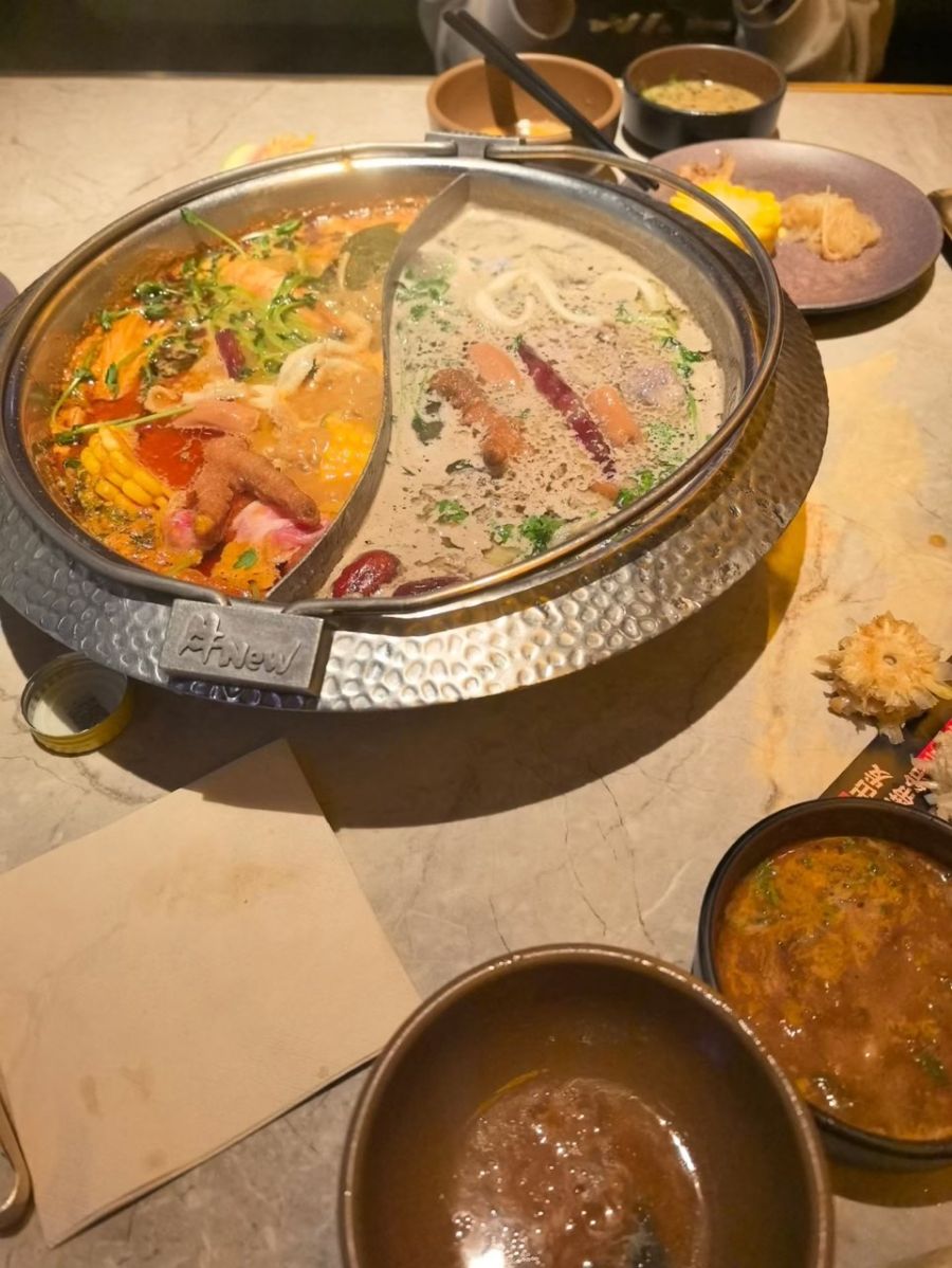 这锅鸳鸯火锅,像一幅色彩斑斓的画卷,在温暖的灯光下散发着诱人的香气。左边是火辣辣的红油汤底,鲜艳的红色让人想起夏日的热情,里面翻滚着玉米、鸡爪、肉片和各种蔬菜,仿佛在欢快地舞蹈。右边则是清淡的白汤,像是冬日的暖阳,里面漂浮着香菜、肉片和一些蔬菜,给人一种宁静而舒适的感觉。