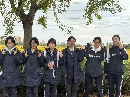 同学们三五成群地沿着步道闲逛。有人在金黄的麦田边拍照,有人蹲在路边捉蝴蝶,笑声飘得老远。