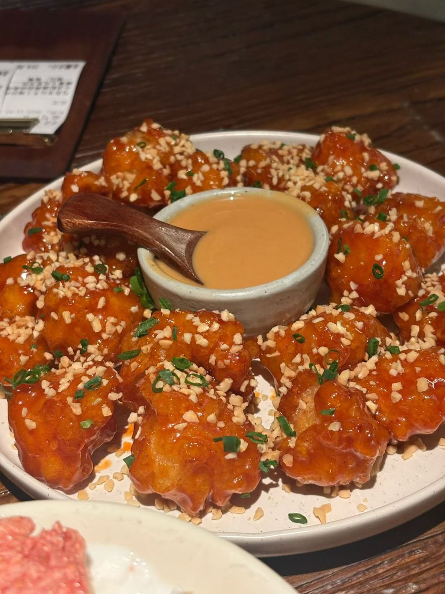 夹起一块咬开——脆壳咔嚓响,热乎的鸡肉裹着甜辣酱汁,花生碎的香混着葱的鲜,裹蘸酱吃又多了层绵密的咸香,连酱汁沾在指尖都想舔干净。