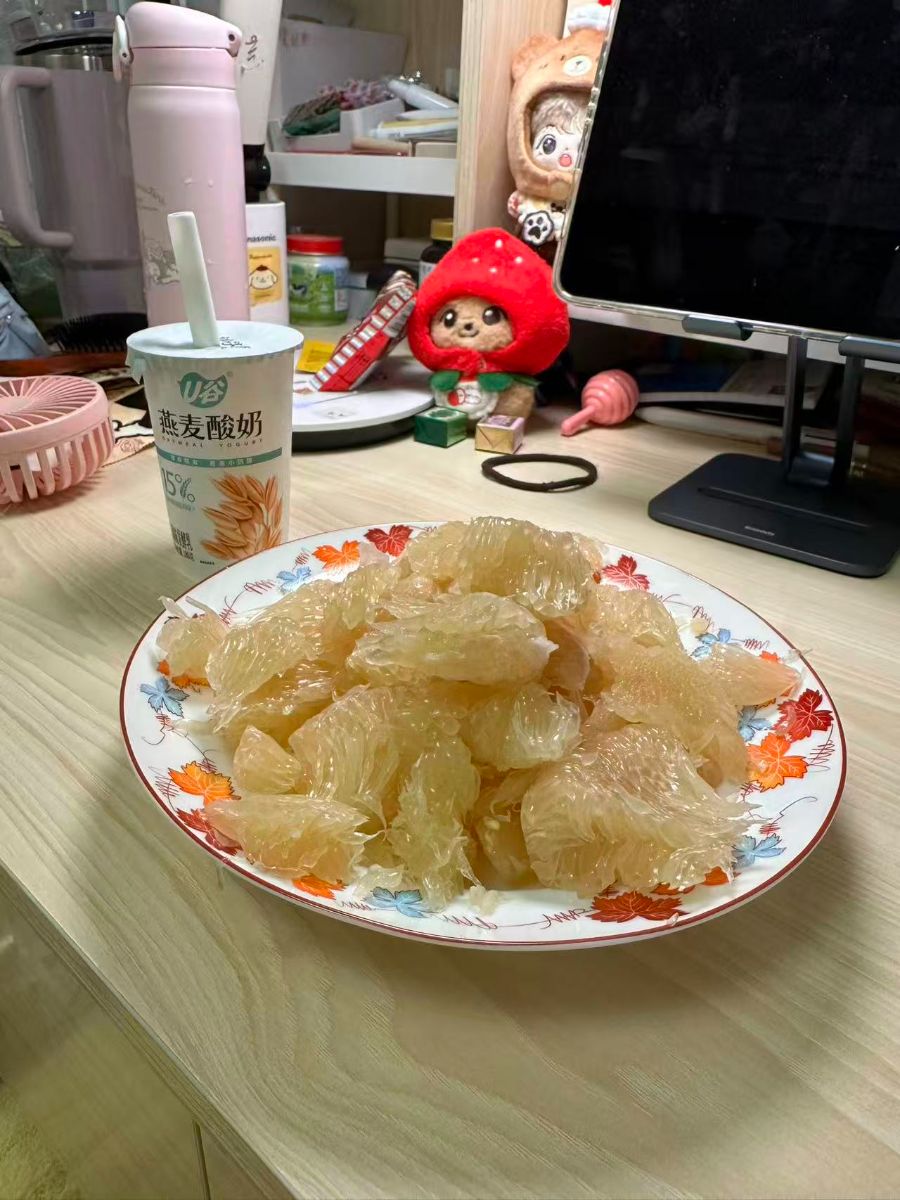 桌角的草莓玩偶耷拉着耳朵,显示器黑着屏,连发圈都随便搭在桌边——没有待回的消息,没有要赶的进度,只有柚子的甜裹着酸奶的醇,顺着喉咙落进胃里。剥柚子时溅在袖口的汁水,都成了“不精致也没关系”的小标记。