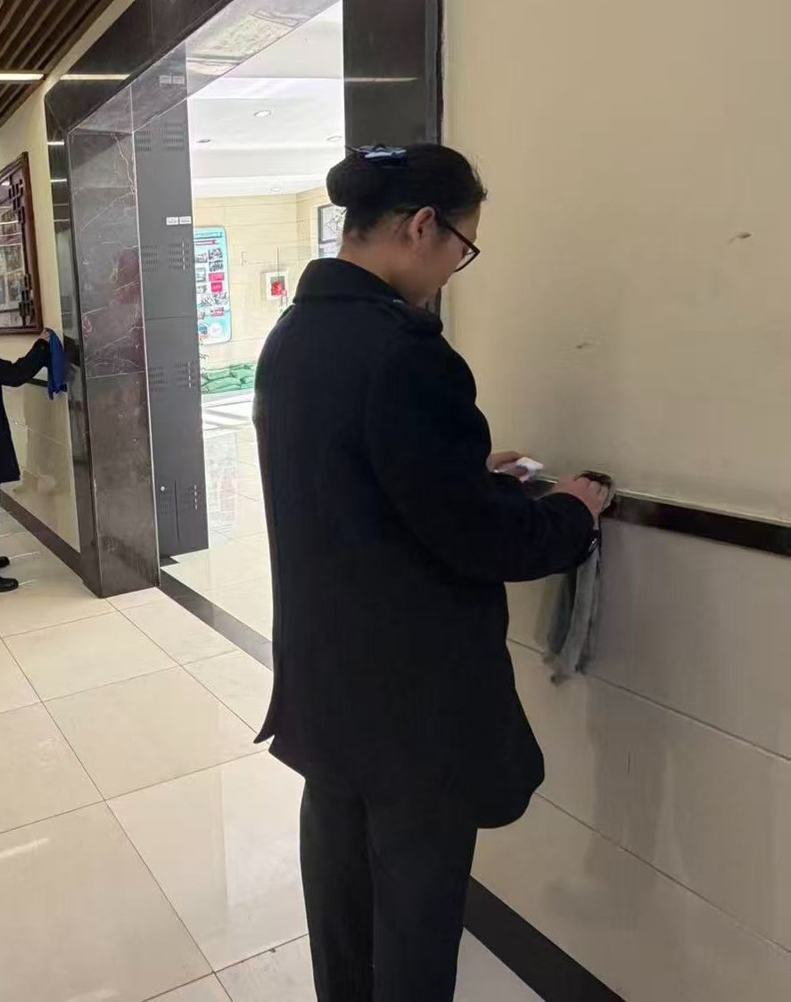 短暂休息后,便开始了一天的劳动。天气的寒冷,使手中的湿抹布也变得刺骨,但为了工作岗位的完成,还是咬牙坚持下来。拿着抹布在楼梯间上下擦拭,脚被皮鞋挤的隐隐发痛,但还是咬牙坚持下来。到了下午,体温渐渐回暖,认真仔细的擦拭起来不易发现的落灰处。