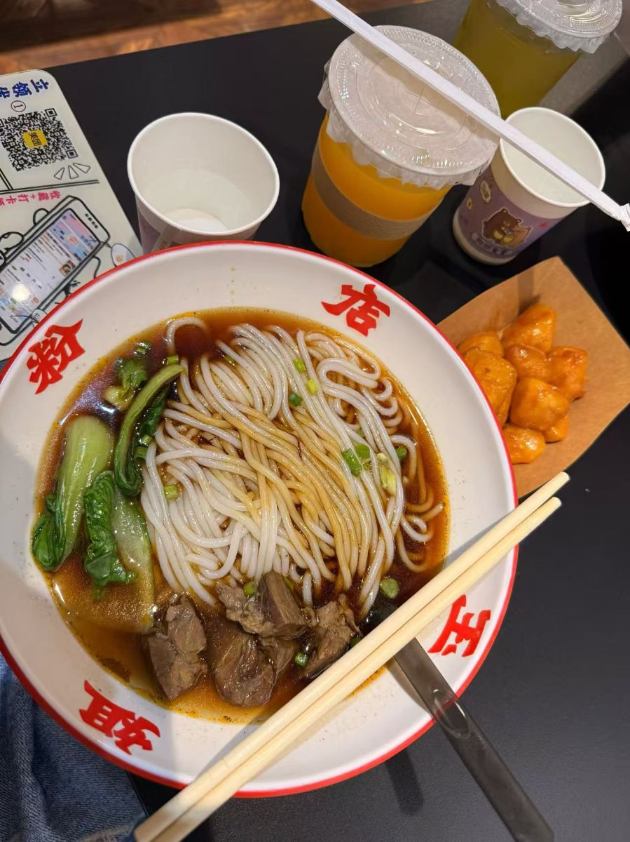 黑色的桌面被暖黄灯光晕出温柔的边界,眼前这碗粉面占据了大半视野——白瓷大碗边缘印着醒目的红底白字,细长的米粉裹着浅褐色的汤汁,几缕葱花像碎金般散在上面。翠绿的生菜叶片还带着水汽的清亮,底下是炖得软烂的酱色牛肉块,纹理里浸着汤汁的咸香。竹筷斜搭在碗沿,旁边露出一小截银色的汤勺,仿佛正等着被拿起搅动碗底的鲜香。右侧牛皮纸托里的橙黄小食滚成一团,裹着油亮的糖霜似的外衣,在光线下泛着甜脆的光泽。身后两只透明奶茶杯里,橙色和黄绿色的液体晃着细碎的光,白色吸管斜斜靠在杯壁,旁边两个空纸杯还留着温热的余温。桌角的扫码点单纸上,印着卡通手机和二维码,仿佛还能听见后厨传出来的汤面咕嘟声。风从门缝溜进来,带着米粉的热气和炸物的甜香,把这片刻的满足揉成了暖融融的形状。