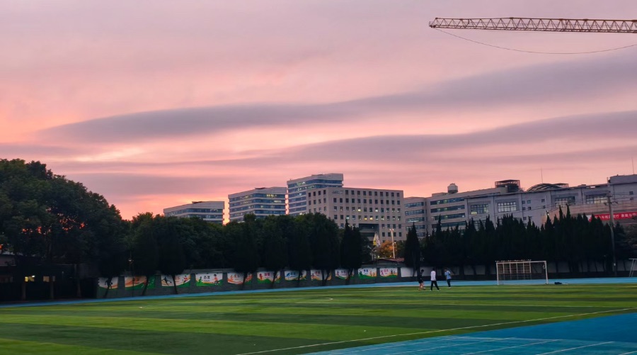当粉紫揉碎在云的褶皱里,黄昏便把温柔铺在了这方操场。蓝绿相间的草皮还浸着白日余温,几缕风裹着叶香掠过,将踢球人的身影抻得细长——脚步轻叩草叶的声响,是青春漏进暮色里的碎音。围墙边的画框亮着鲜活色块,与楼宇次第醒转的窗灯遥遥相映;连钢筋骨架的塔吊,也在粉霞晕染里卸去冷硬,成了柔色天幕下轻描的一笔。风渐软时,天的颜色又浅了三分,而这方天地里的烟火与温柔,正随着晚星初醒,慢慢沉进眼底。