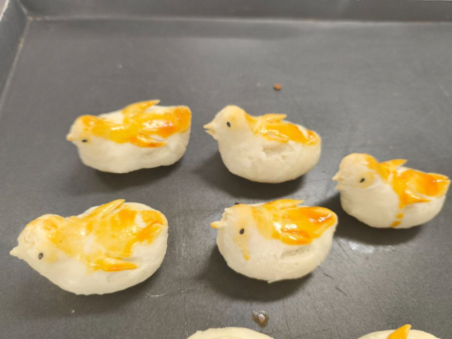 3. 造型:将包好馅料的酥皮面团,用手工或模具塑造成小鸡的形状。