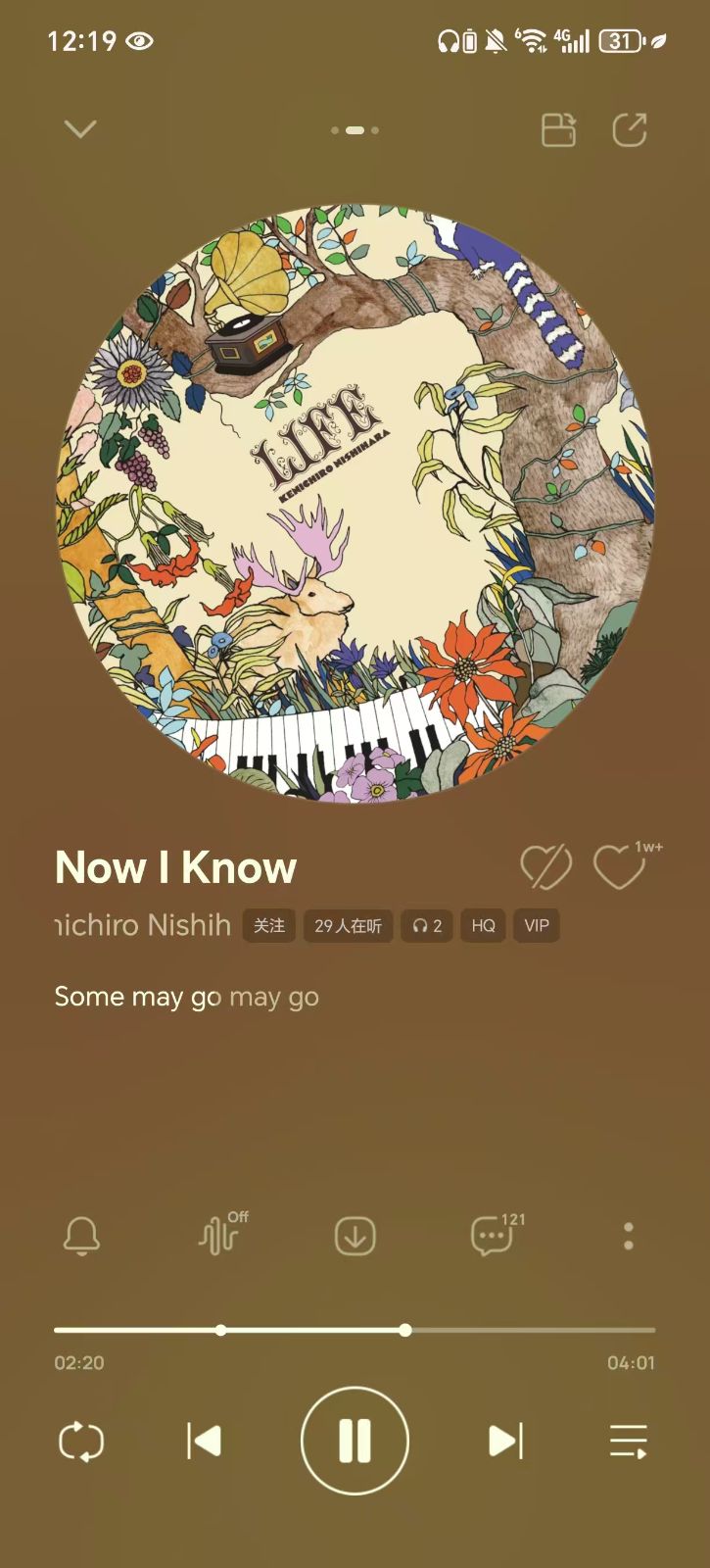 凌晨12:19,4G信号只剩最后一格,像垂危的萤火虫。屏幕截图里,Nichiro Nishih的直播间静静躺着29颗孤独星球,HQ标识发出幽蓝冷光,VIP小皇冠悬在昵称上方,像一枚被海水锈蚀的勋章。进度条停在02:20,歌词“Some may go, may go”被时间码切成碎片,仿佛有人在海底摁住留声机,让离别循环溺毙。黑底白字“Now I Know”像一句迟到的忏悔,在视网膜上烙下细小闪电——原来所谓顿悟,不过是深夜信号崩溃时,耳机里突然听懂的一句英文。窗外城市正在断电,屏幕却固执地亮着,像不肯熄灭的灯塔,照见29个不肯睡的灵魂,一起把寂寞熬成盐