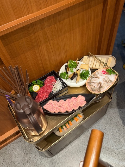 木质的隔断旁,一辆精致的餐车静静停着,金色的金属框架在暖光下泛着柔和的光泽,和木质的纹理相映成趣,透着几分雅致。餐车上的食材摆得满满当当,每一份都透着新鲜的气息。