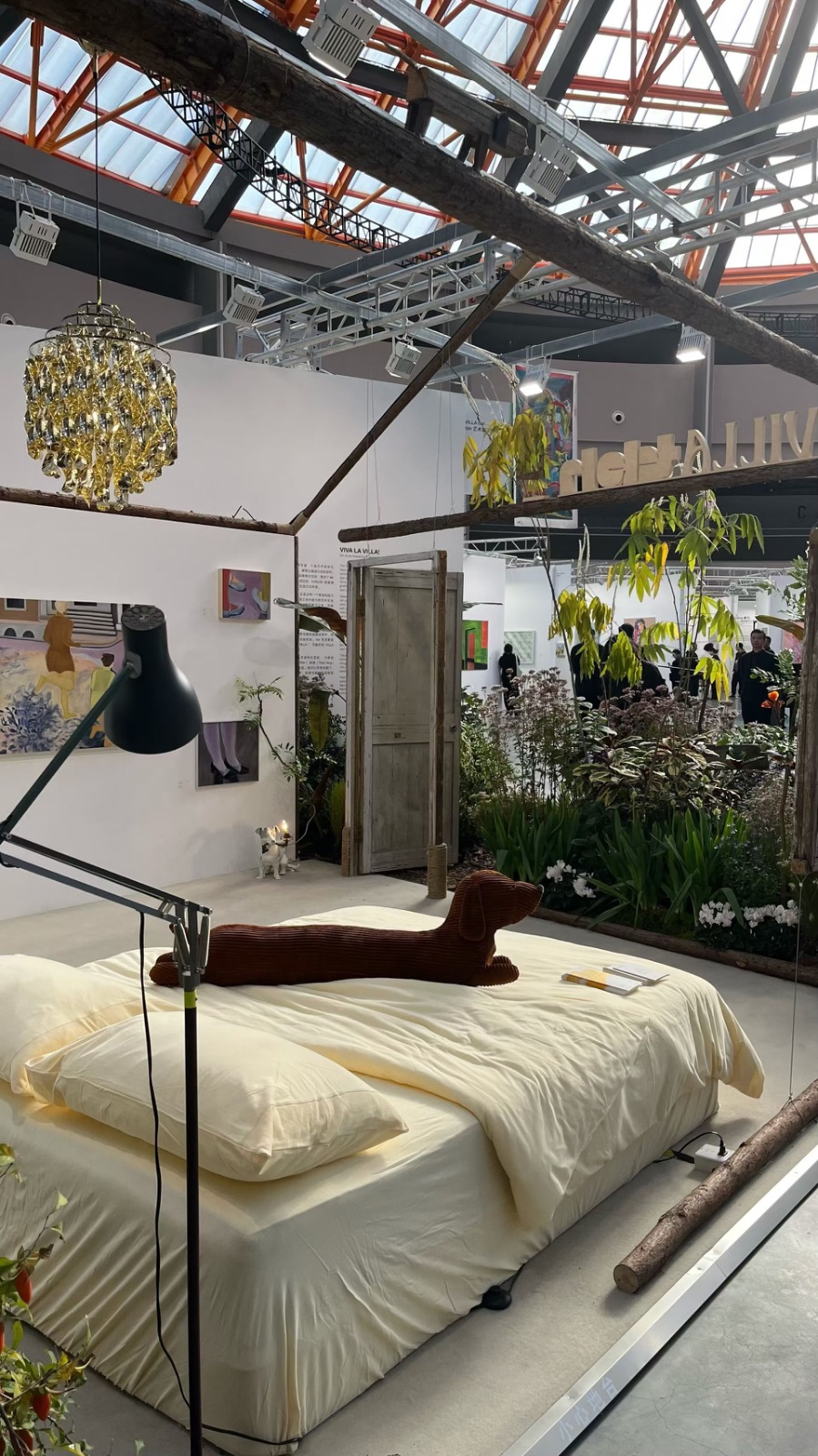 半敞的旧木门后,绿植正往“房间”里漫——芭蕉叶的阔绿蹭着墙面的画框,画里的人影和远处展厅里的观展者影影绰绰叠在一起,连脚边横卧的原木都沾了点花叶的潮气。这空间像把卧室、丛林、工业厂房的碎片全倒进搅拌机,怪诞却松弛,每一眼都能撞见两种毫不相干的质感在悄悄较劲。