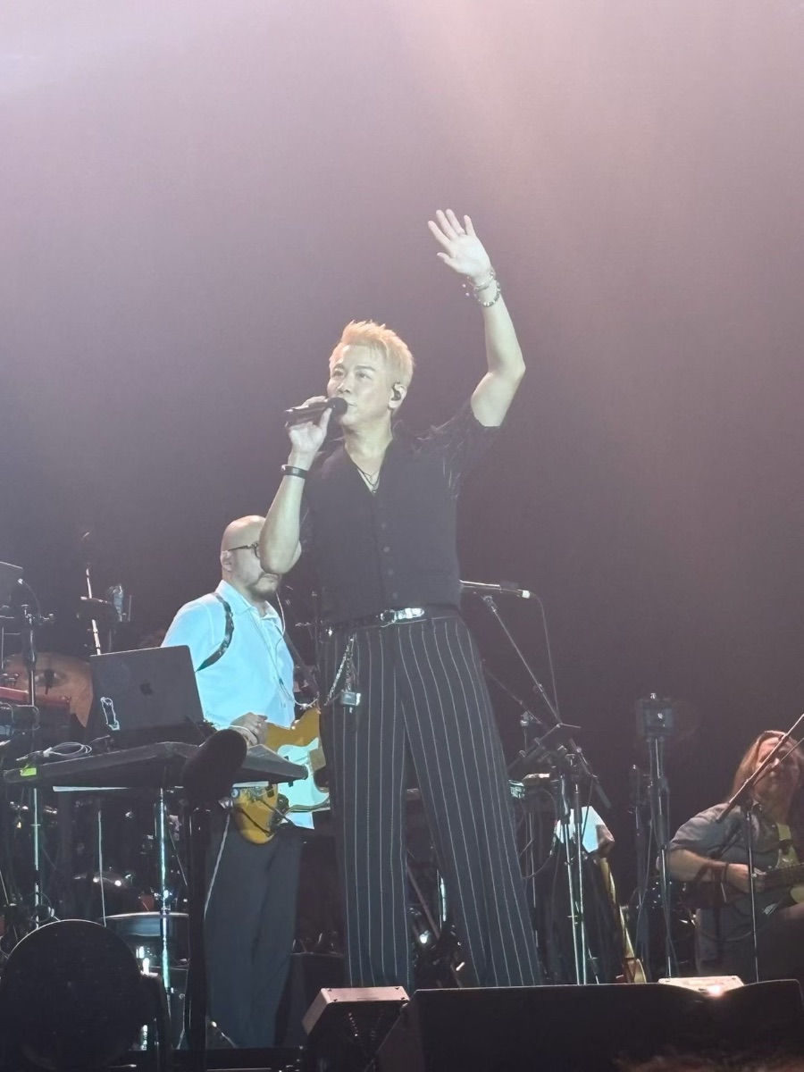 身后的乐手们埋在设备堆里:键盘手盯着笔记本的屏幕,吉他手指尖扫过琴弦,灯光在他们身上切出明暗的块面,像把后台的烟火气也缝进了这场演出里。这一幕最动人的,是他抬手时的松弛——不是刻意的舞台设计,更像和台下歌迷碰了个无声的杯,把《找自己》的热烈、《寂寞的季节》的柔软,都揉进这一抬手里。