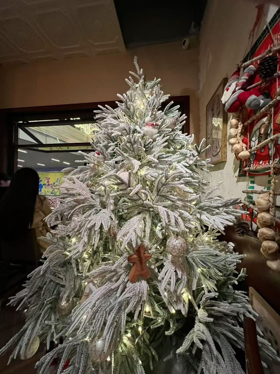 浅白的绒雪裹着松针,缀着几个软乎乎的小挂饰,棕色的姜饼人模样的装饰藏在枝叶间,和莹白的球饰一起,把树衬得像从童话里搬来的。