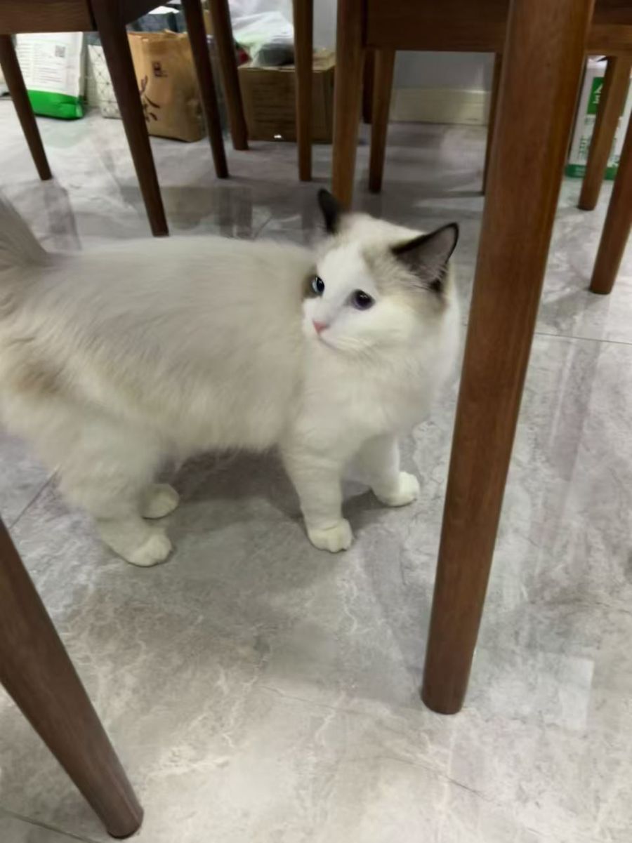浅灰色的瓷砖地面上,一只布偶猫安静站在木色桌椅的缝隙里。它的毛像被揉过的云朵,蓬松又软白,只有耳朵尖染着淡淡的灰黑,像落了一小片墨。