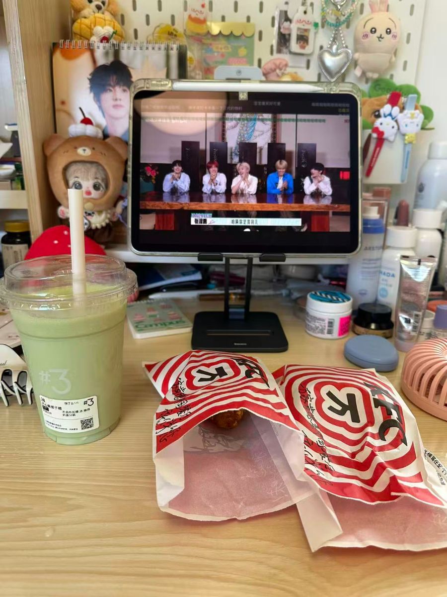 把外卖袋里的抹茶饮品插上吸管时,杯壁的凉气漫过指腹,在暖烘烘的房间里洇出一圈细小的水珠。桌上的红白包装还留着食物的香气,我把平板架在支架上,屏幕里的画面慢悠悠地晃着,其实没怎么看进去,只是喜欢这种“什么都不用急”的松弛感——头发随便挽成一个丸子,睡衣的领口还歪着,脚边堆着没来得及收的玩偶。窗外的阳光从窗帘缝里漏进来,在地板上划了一道细长的光带,偶尔有风吹过,把书架上的便签纸吹得轻轻作响。我吸了一大口冰凉的抹茶,甜味混着茶涩漫过舌尖,忽然觉得这样的“无聊”比任何热闹都让人安心,像是把自己裹进了一团晒过太阳的棉花里。