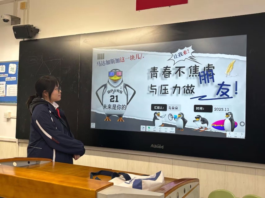 今天的班会由本班马朵朵同学主持。这次“青春不焦虑,与压力做朋友”主题班会,我收获特别多。原来身边同学的焦虑都很相似,有的来自学业成绩的压力,有的担心未来的选择,还有的因为和朋友的相处小事烦恼。之前总觉得只有自己在焦虑,现在才知道这是青春里很正常的情绪,瞬间轻松了不少。