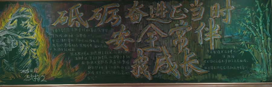 当粉笔勾勒的火焰纹路在黑板一角跃动,“砥砺奋进正当时,安全常伴教研长”的主题便有了生动注脚。这方板报,是消防与学习的交响——左侧明黄与橙红交织的“火焰”,是119消防日的警示,也恰似青春奋进的热忱;右侧舒展的“竹影”,则藏着陆游“冬夜读书示子聿”的治学意趣,让安全与求知的底色在此交融。