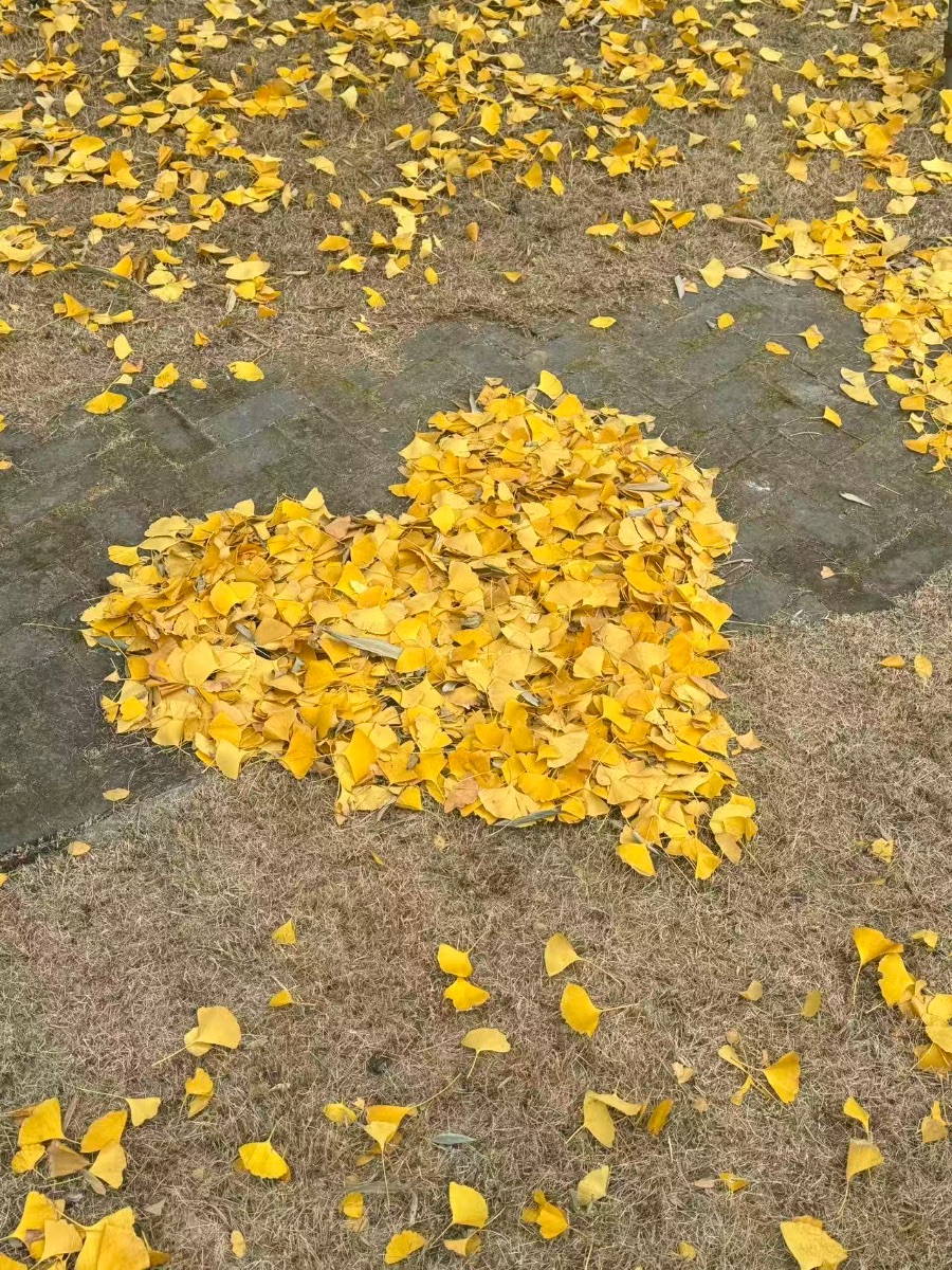 午后在公园散步,看到地面上有人用银杏叶摆成了一颗爱心,瞬间被这份浪漫戳中了。金黄的银杏叶像小扇子,一片片拼凑出饱满的爱心形状,散落的叶子铺在褐色的草地上,像撒了一地的星光。蹲下来仔细看,每片叶子的纹路都清晰可见,阳光洒在上面,泛着温暖的光泽。不知道是谁花了心思做了这样的小美好,或许是情侣,或许是童心未泯的路人。我坐在旁边的石凳上,看着这颗银杏爱心,风一吹,叶子轻轻晃动,仿佛在跳动。秋天的浪漫大抵就是这样,不用昂贵的礼物,只是自然的落叶,加上一点巧思,就能让人心里暖洋洋的,也让我想起要多用心发现生活里的小浪漫。