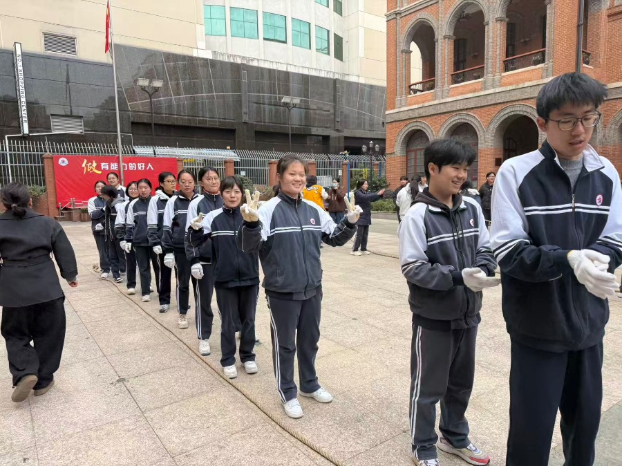 参赛队员们早早来到赛场,大家互相搓着冻红的手,又合力把粗麻绳捋直,找到最顺手的位置握紧。比赛还没开始,两队就已经摆好架势——脚蹬着脚、肩并着肩,身体使劲后倾,像一排排扎根大地的小松树,连眼神里都透着一股不服输的劲儿。围观的同学也围成一圈,有的举着自制的加油牌,有的攥着拳头,就等裁判的哨声。