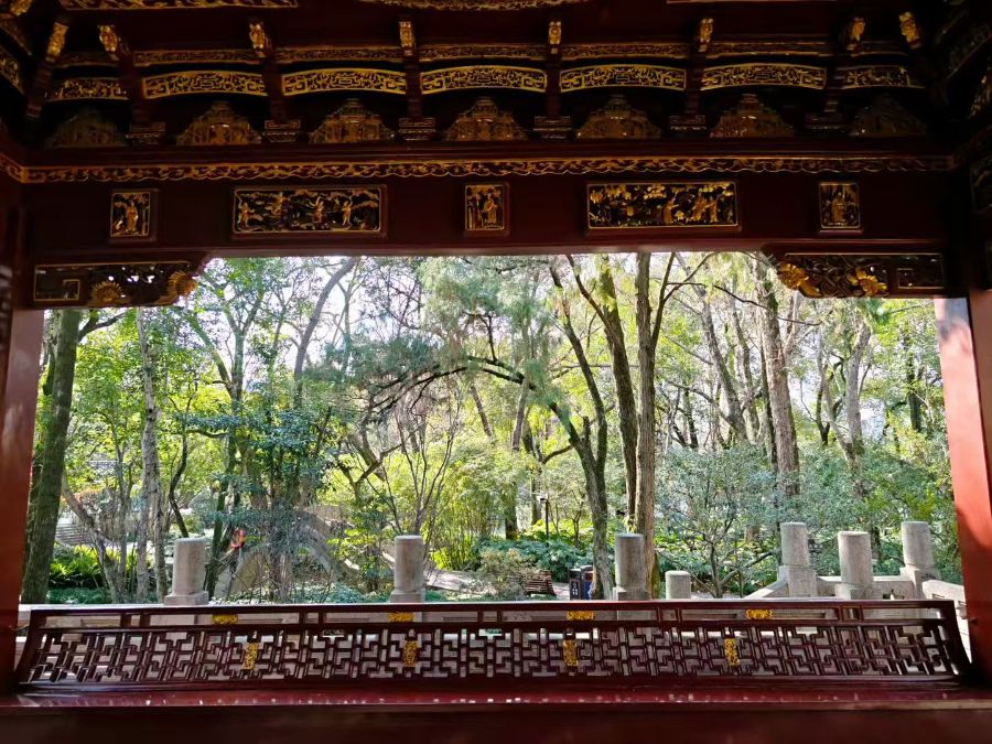 我倚着廊柱静坐片刻,听着林间的鸟鸣,忽然懂了中式园林的妙处——以建筑为框,把自然的生机框进眼底,一抬眼,就是藏不住的诗意。