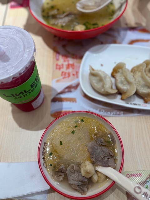 用勺子舀起一口汤,鲜而不腻的滋味在舌尖散开,粉丝滑溜溜地溜进嘴里,软韧又入味。旁边的煎饺底壳煎得金黄焦脆,咬开是饱满的肉馅,和粉丝汤配在一起,口感层次瞬间丰富起来。桌上还摆着一杯LINLEE的手打柠檬茶,酸甜的果香中和了汤面的温热,一口茶一口汤,惬意得很。