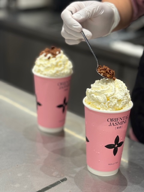 站在茉莉奶白的柜台前,看着店员戴着白色手套,用小勺将酥脆的巧克力碎轻轻撒在绵密的奶油顶之上,粉粉的杯身印着黑色的茉莉花纹样,光是这视觉上的美好,就足以让人心头漾起暖意。