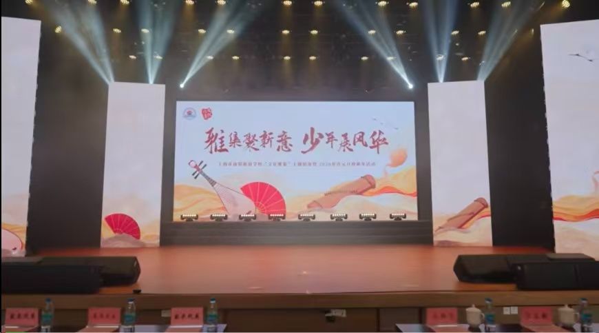 学校的迎新晚会舞台也太惊艳了!主屏幕上“雅集聚新意 少年展风华”的主题字样大气又亮眼,琵琶、折扇的国风元素搭配暖色调的背景,瞬间拉满中式美学氛围。舞台上的灯光束交错流转,空旷的舞台仿佛正等待着同学们的精彩表演,光是看着就已经充满期待。这次晚会以国风为底色,能感受到学校满满的用心,也让我们对中职生活的新一年更加憧憬。期待同学们在舞台上绽放光芒,用才艺书写属于我们的少年风华!