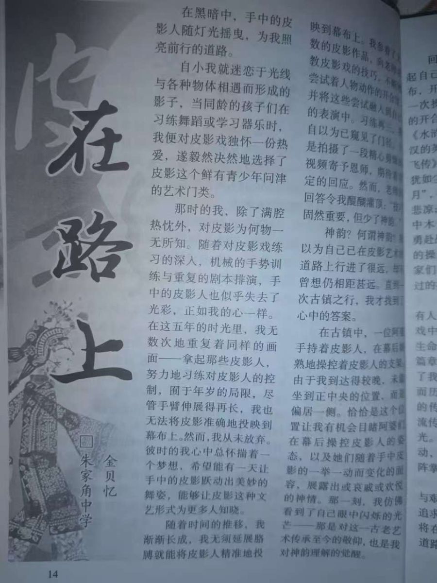 读《在路上》一文,我被作者与皮影戏相伴的逐梦历程深深触动。作者自小便痴迷皮影,在鲜少有青少年涉足的领域里坚守五年,从懵懂摸索、机械训练,到因“少了神韵”陷入困惑,最终在古镇偶遇老艺人,于幕后窥见皮影操控的情感内核,完成了对艺术神韵的觉醒。这段旅程不仅是技艺的精进,更是对传统艺术的敬畏与理解的深化。它让我明白,追寻热爱的路上,技巧只是基础,唯有融入情感与敬畏