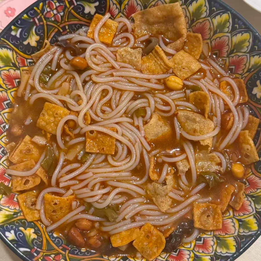 终于吃到了心心念念的螺蛳粉,幸福感直接拉满!端上桌时,那股熟悉的酸香瞬间勾起食欲,红亮的汤汁裹着Q弹爽滑的米粉,炸腐竹吸饱了浓郁汤汁,一口下去酥香入味,脆嫩的酸笋、绵密的花生、爽口的酸豆角,每一样都是灵魂。花纹繁复的彩碗衬得米粉愈发诱人,拍照都格外好看。嗦粉的瞬间,所有学习的疲惫都被治愈,辣意顺着喉咙蔓延,吃得满头大汗却停不下来。一碗螺蛳粉,就是平凡日子里最直接的快乐,没有什么烦恼是一碗螺蛳粉解决不了的,如果有,那就两碗。吃完浑身舒畅,连心情都跟着亮堂起来,这就是美食的魔力吧。