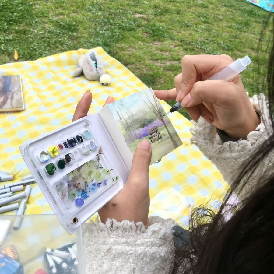 铺一块明黄格纹野餐布在草地上,风里裹着青草与泥土的气息,我把迷你水彩本捧在掌心,开始描摹眼前的春光。