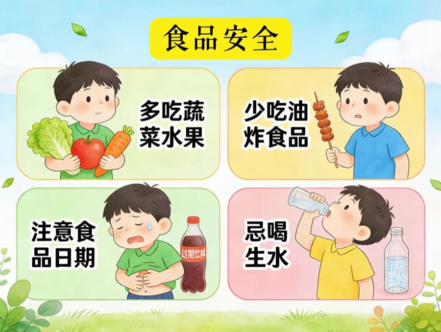 关注食品安全,就是爱护自己的身体。让我们从现在做起,从小事做起,养成良好的饮食习惯,平安快乐地成长。