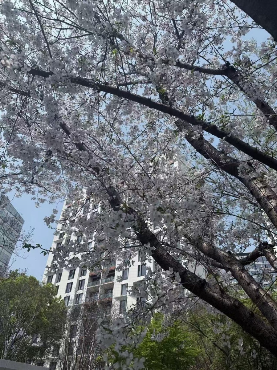 粗壮的深褐枝干纵横交错,向天空肆意舒展,每一根枝桠都缀满了粉白相间的樱花。花瓣轻盈剔透,白中晕着淡淡的粉,层层叠叠簇拥在枝头,风过处似有细碎的花影摇曳,连空气都仿佛浸满了清甜的香气。透过花树的缝隙,一栋米白色的现代楼宇静静伫立,利落的线条与柔美的花枝相映成趣,玻璃窗户在阳光下闪着微光,为这幅春日画卷添了几分都市的鲜活。