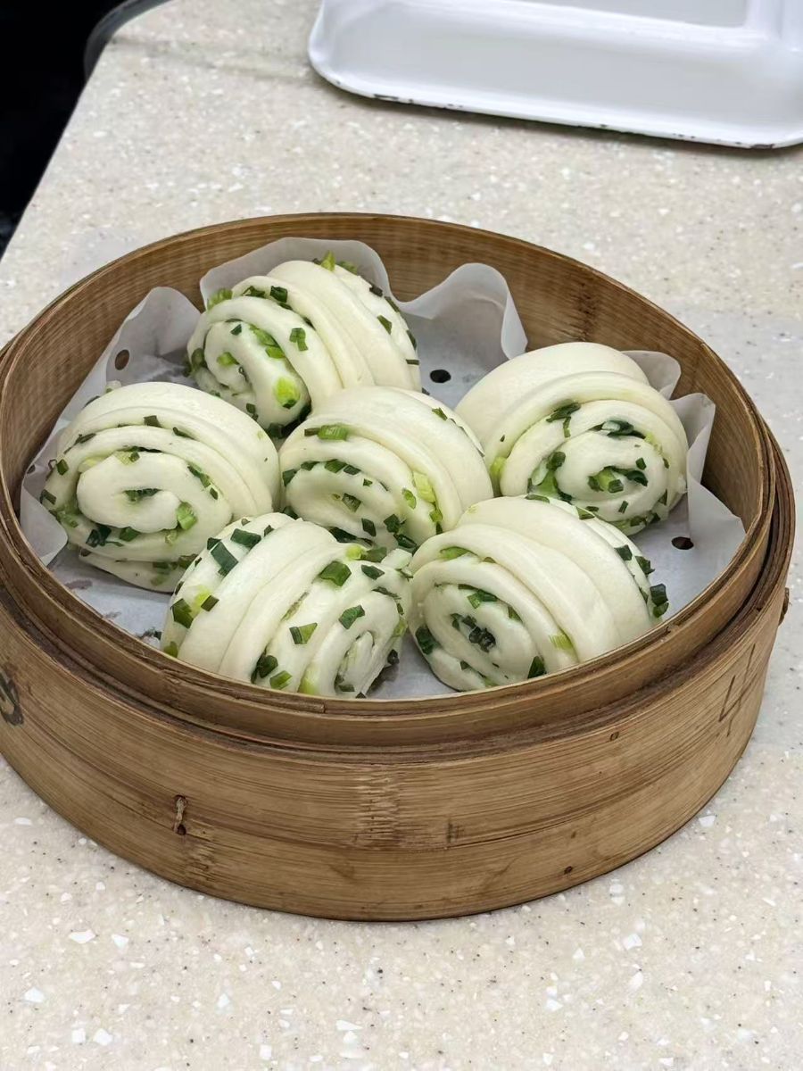 等待面团发酵的过程充满期待,看着它慢慢变得蓬松柔软,仿佛充满了生命力。擀面皮、抹油、撒盐和葱花,每一步都要细致均匀。卷制、切段、捏出花纹时,我格外小心,努力让每个花卷形状规整好看。