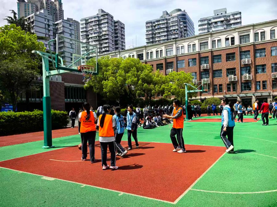 阳光倾洒在红绿相间的塑胶球场上,篮球架的绿色支架在阳光下泛着温润的光,背景里的红砖教学楼与葱郁绿树相映,勾勒出最鲜活的校园图景。身着橙蓝队服的少年们围聚篮下,指尖轻触篮球的瞬间,仿佛触碰到了滚烫的青春脉搏。篮球撞击地面的“砰砰”声,是少年们心跳的节奏,球鞋摩擦球场的声响,裹挟着汗水与朝气,在空气中肆意流淌。