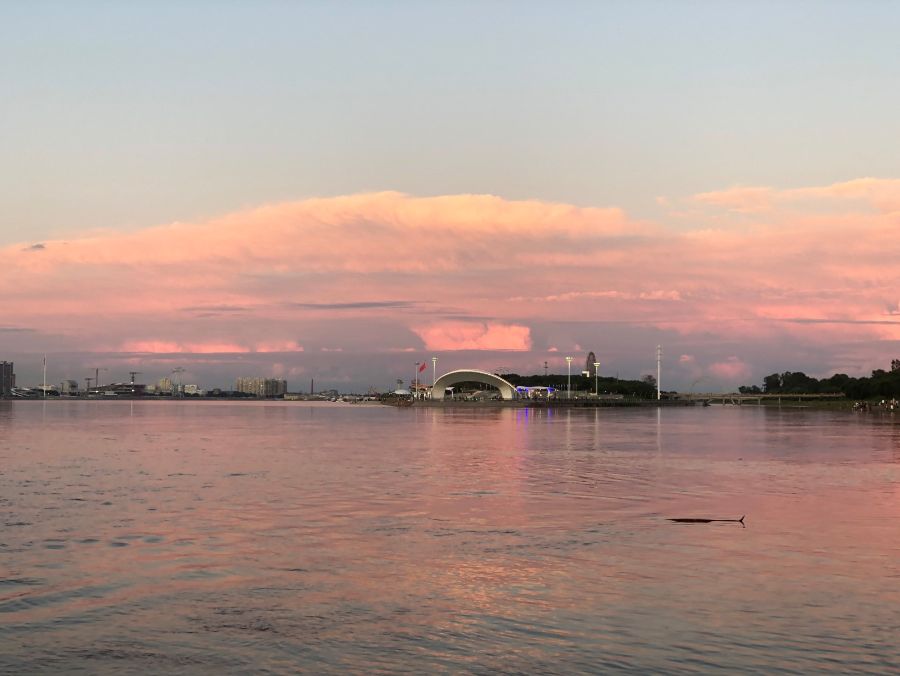 厚重的云团横亘在天际,被落日染出层次分明的暖色——从淡粉到沉灰,在天幕上慢慢晕开,给这座小城笼上一层静默的暮色。江水静静流淌,把漫天云霞完整地映在水面上,粼粼波光里,岸边的白色拱门、城市楼宇、江畔林木,都在水中投下清晰的倒影。江风掠过水面,带着边境特有的辽阔气息,也带着历史的余温。