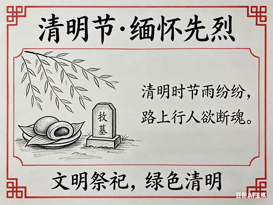 站在这张清明节黑板报前,肃穆与追思漫上心头。粉笔勾勒出的青松翠柏静静伫立,英烈们的事迹在字里行间重燃。我们如今的安稳岁月,是他们以血肉之躯换来。清明节不仅是祭扫先人的传统节日,更是铭记历史、致敬英雄的时刻。先烈们的爱国精神如明灯,照亮我们前行之路。身为新时代青年,当传承这份热血,以奋斗告慰英灵,将个人理想融入国家发展,让红色基因在新时代赓续传承。清明不止是感伤,更是铭记与传承。缅怀故人,让我们懂得感恩生活、珍惜当下;致敬英烈,让我们传承赤诚的家国情怀。作为新时代少年,我们应当牢记历史、心怀敬畏,不负先辈付出,以努力和成长奔赴前路,不负韶华,不负山河。