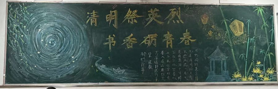 清明寄哀思,书香润成长。黑板上“清明祭英烈,书香砺青春”十个大字庄重有力,搭配翠竹、黄花、古亭与流水,勾勒出肃穆又雅致的春日意境,也诉说着我们对英烈的深切缅怀。