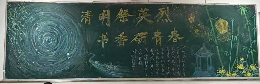 清明雨润,纸船载思,竹林映亭,孔灯寄情。黑板上的淡蓝水纹,漾着纸船与星光,正如我们心中对英烈的追念,清澈而坚定。金色的标题笔力千钧,“清明祭英烈,书香砺青春”,道尽我们的初心。
