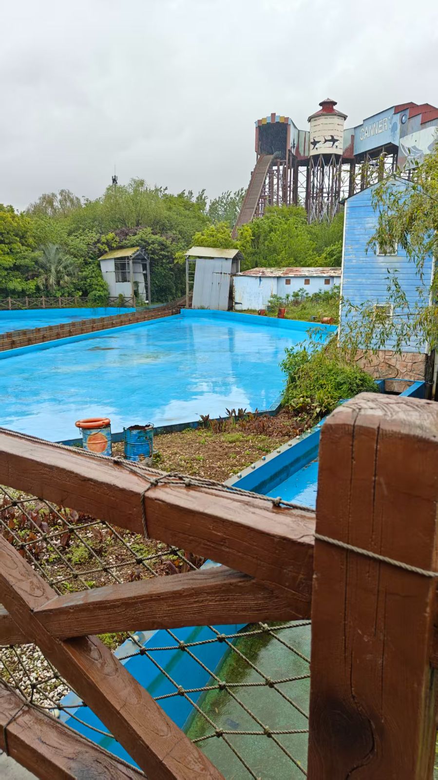 阴雨天的上海欢乐谷,少了往日的喧嚣热闹,多了几分安静与怀旧。曾经人气爆棚的激流勇进项目,此刻正静静地沉睡着。