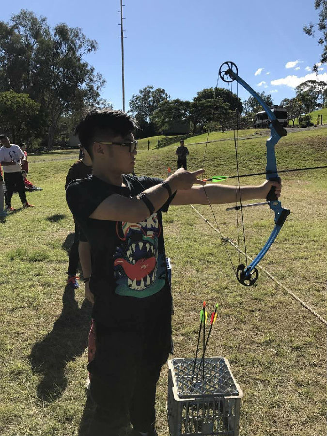 按照老师的示范,架起箭,用力拉开弓。射箭这项运动看起来容易,做起来难。在小编进行第一步架箭时,那只刚搭好的箭就一直调皮地从弓上滑下,小编只好努力控制好自己手上的力气,轻轻地拉开弓,“噗”,却是射了个闷箭,箭从靶旁飞过,牢牢地扎入土地。
