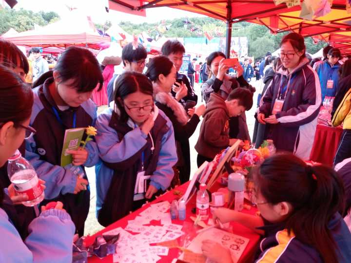 我校社团展示的互动部分,分为橡皮章制作与折纸学习两个活动部分,前来观看的游客可以选择自己喜欢的橡皮章印制的书签作为纪念品并且可以当场留下联系方式定制属于自己的图章,也可以与折纸社的同学一起学习各类精巧的折纸作为纪念带走。