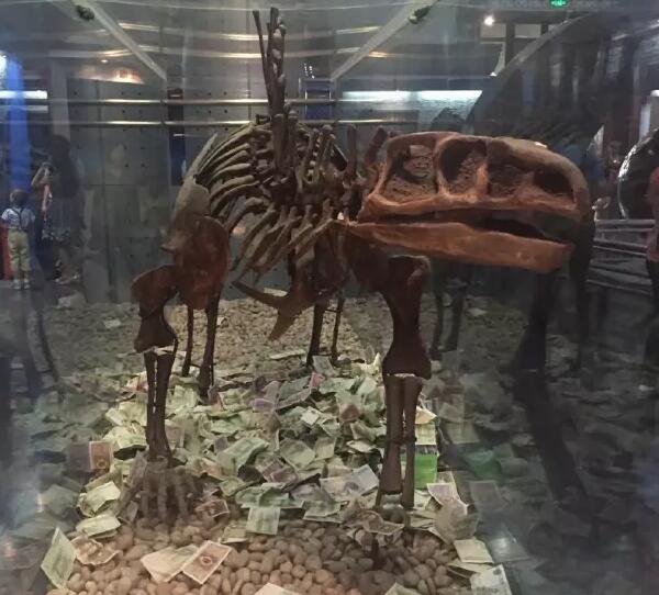 北京自然博物馆,5米长的无齿芙蓉龙骨架展柜,就曾沦为“投币箱”“许愿池”。工作人员称,这些钱大部分是游客从展柜上方和四周的缝隙塞进去的。
