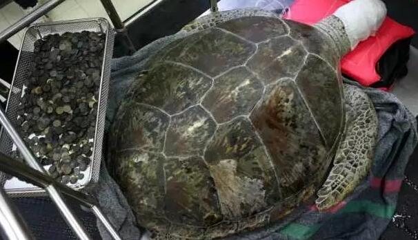 原来,海龟生活的池塘被游客当作许愿池投入了大量各国硬币,多年来,海龟一直在误食池中的“好运硬币”。不难想象,这只海龟在这些年过着多么痛苦的生活。
