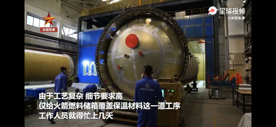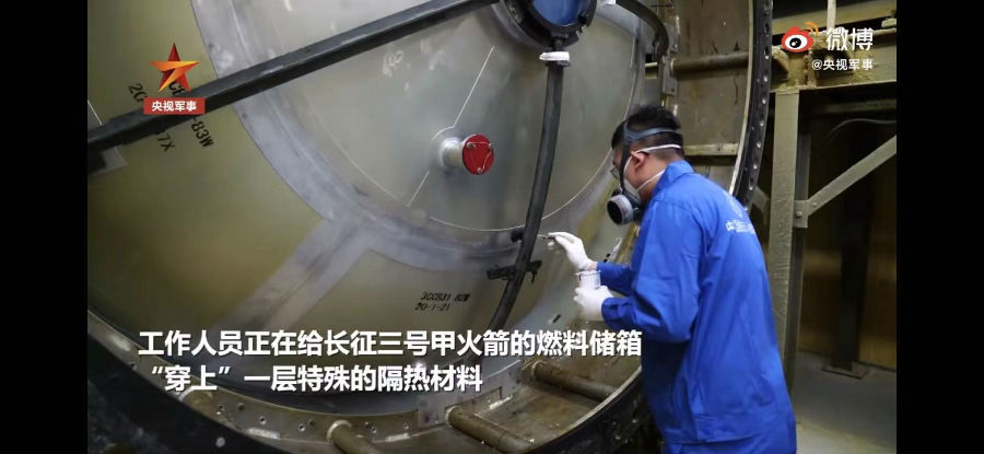 在北京的航天科技集团一院生产车间里,工作人员们正在长征三号甲火箭的一个燃料储箱旁边忙碌着。由于长三甲火箭使用了超低温的液氢液氧作为推进剂,在常温下特别容易挥发,他们要做的工作就是给燃料储箱“穿上”一层特殊的隔热材料。