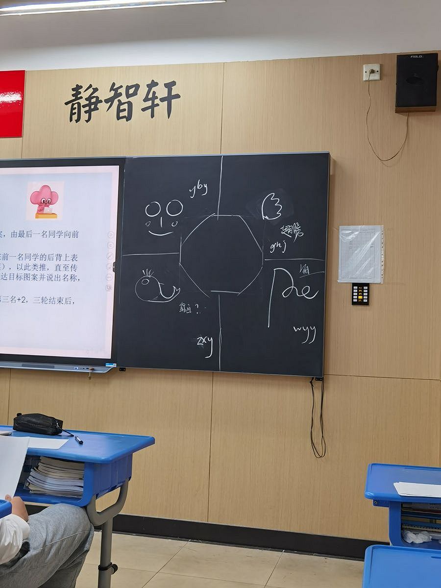 5月11日中午,我班开展了一场“后背传画”的小游戏。游戏以组为单位。游戏前,裁判会给小组最后一位同学发放图案。最后一位同学通过画画的方式向前传递,直至第一位同学。第一位同学需在黑板上画出图案,准确画出图案并说出名字的小组即获胜。要求游戏过程中不许回头,交谈。
