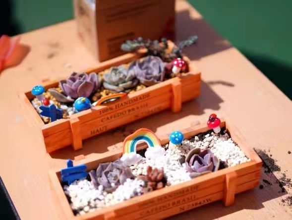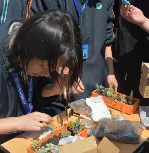 我校团委事先已准备好20张桌子和40份种植多肉植物的材料包,包含多肉植物、木盒、铺面石、营养土、摆件和铲子。在操场的显眼处,贴着团委学生会宣传部制作的多肉植物栽种步骤图。每个班级的团支书携带一位自己的本班同学参加植树节活动。活动伊始,同学们迫不及待地拆开包装盒,仔细阅读包装上的种植说明和多肉植物栽种步骤图,互相讨论,研究如何种植多肉植物。了解后,各班的两位同学进行密切协作,开始拿起小铲子认真地把营养土填入木盒,小心翼翼地将多肉植物种进营养土中,然后喷洒适量的水来滋润营养土,使得多肉植物更快地吸收养分,最后铺上铺面石和摆件宣告种植完工。