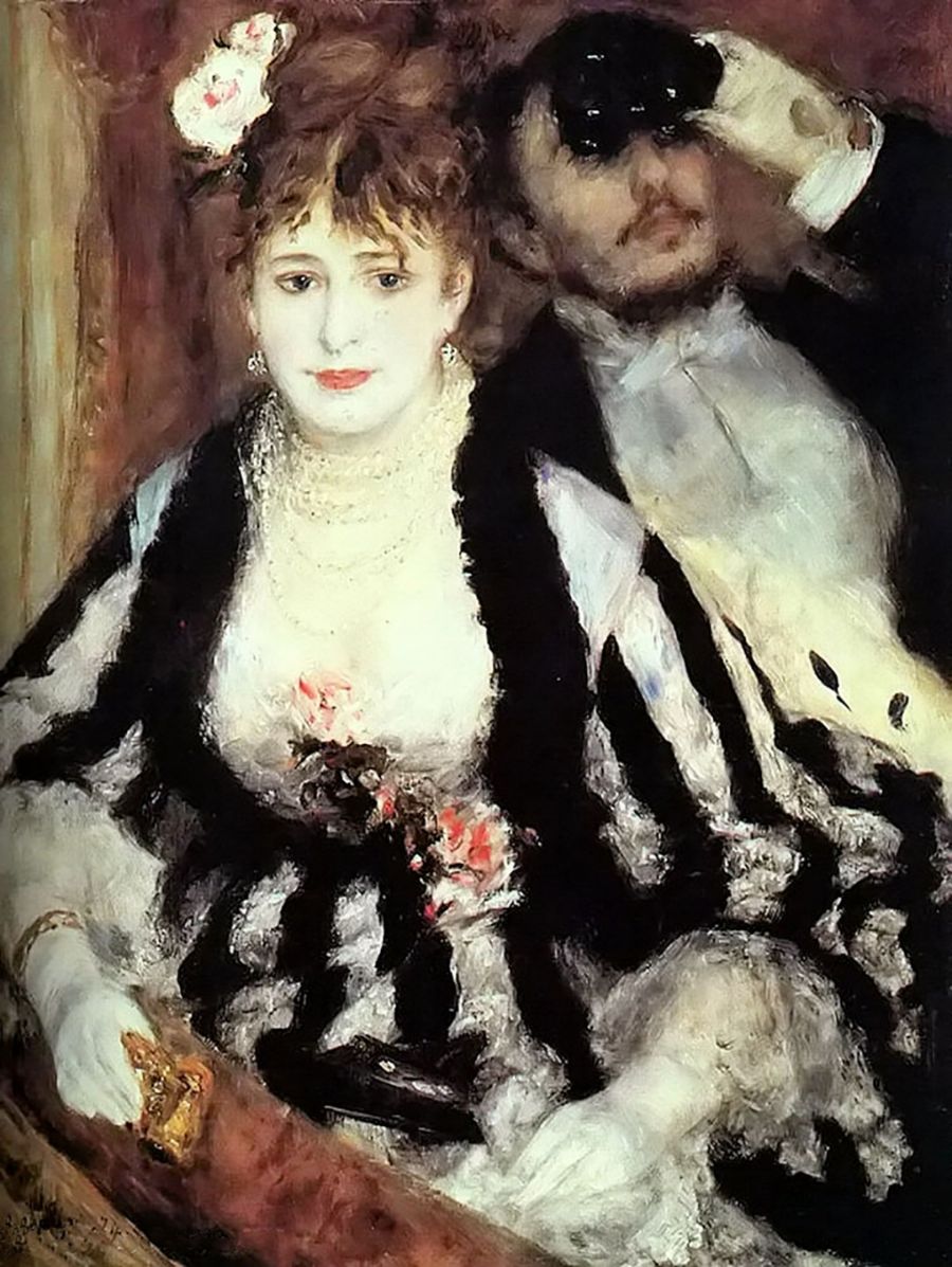 《包厢》(The Theater Box)则是雷诺阿正式参加印象派美展的第一次参展作品之一。他一共送去七幅油画。这幅画根据他在剧院里所得的“印象”,回到画室里请人摆模特儿画成的。画上前面那个盛装贵妇是一名叫尼尼·洛比丝的模特儿扮成的。后面手拿望远镜的中年绅士形象,则是由雷诺阿的一个兄弟充当模特儿的。