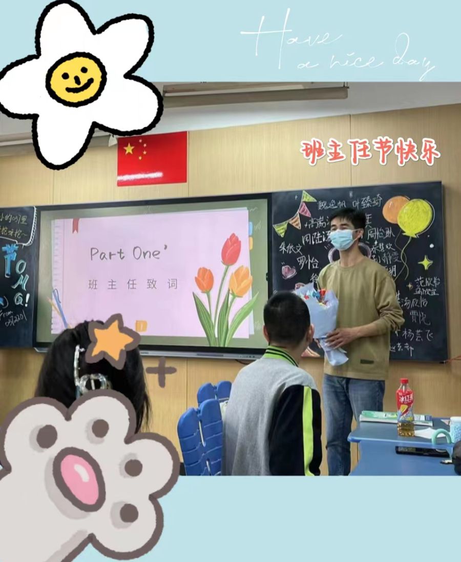 本次主题班会由 汤欣怡 同学主持,开展“感恩相伴,守护成长”主题班主任节活动,向班主任吴小毛老师表达谢意。