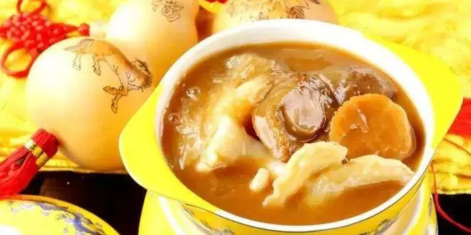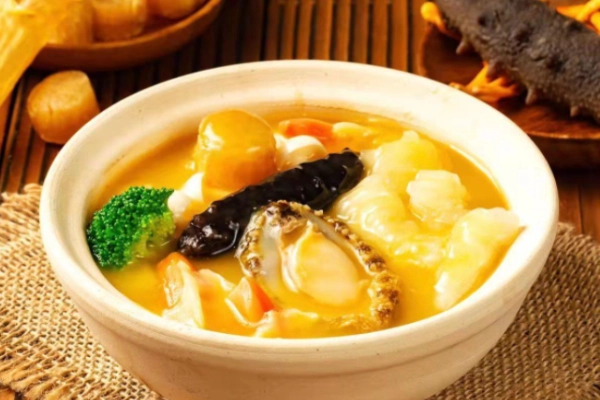 佛跳墙通常选用鲍鱼、海参、鱼唇、牦牛皮胶、杏鲍菇、蹄筋、花菇、墨鱼、瑶柱、鹌鹑蛋等汇聚到一起,加入高汤和福建老酒,文火煨制而成。